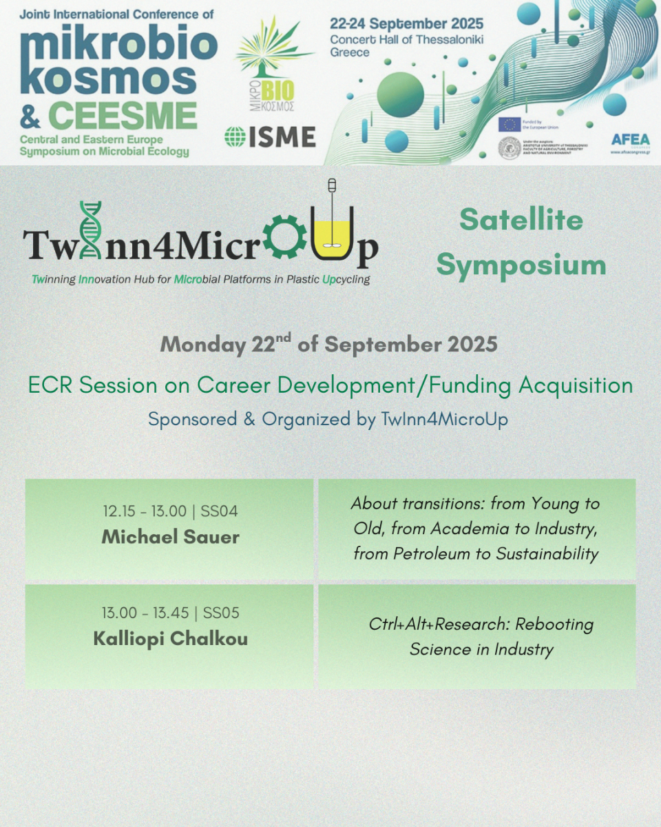 The TwInn4MicroUp project is pleased to announce its participation in the Joint International Conference of Mikrobiokosmos & CEESME – Central Eastern Europe Symposium on Microbial Ecology (MBKCEESME 2025), taking place from 22nd–24th of September 2025 at the Thessaloniki Concert Hall in Greece. The conference is organized by the Hellenic Scientific Society of Mikrobiokosmos, in collaboration with the International Society for Microbial Ecology (ISME).